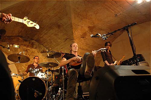 Et puis ça lancine et puis la basse s'invite et d'un seul coup, la batterie martèle et l'autre guitariste s'invite. Le mur du son se construit devant nous et David Eugene Edwards chante de plus en plus fort, son cou est rouge, les carotides sortent, ses pieds s'agitent dans tous les sens, il a les yeux le plus souvent fermés, comme s'il était en transe et quand il les ouvre, mon dieu, son regard est habité... et ça fait peur. La chanson redescend et puis remonte comme ça plusieurs fois.