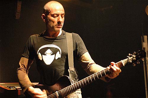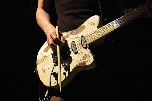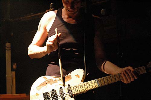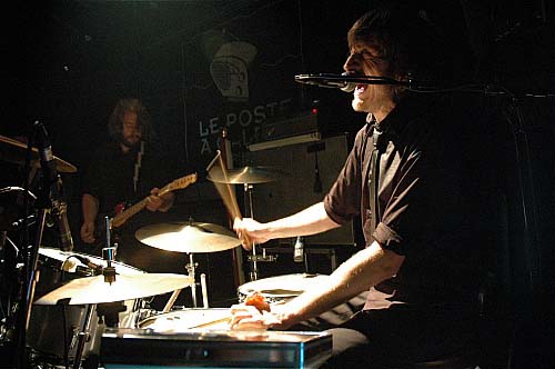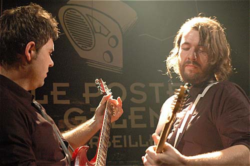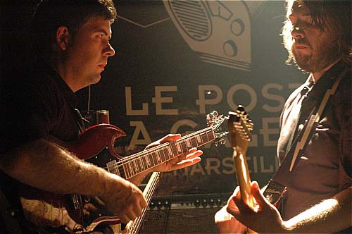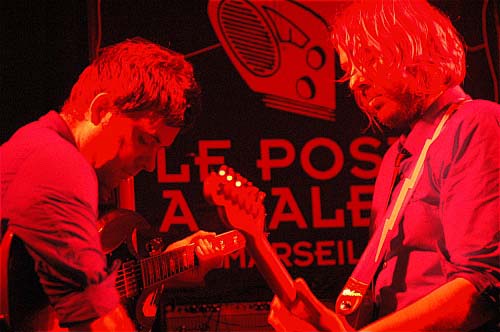 De l'autre côté, le filiforme Marc ne joue "que" bizarrement : très peu de riffs. Plutôt en petits pickings secs, ou bien en frappant sa guitare avec une baguette de batterie, (ce qui donne immanquablement un son à la Thurston Moore, sonique et chaotique tout à la fois, disons chaotiquement sonique). Soit encore en la caressant avec un archet, ce qui donne tout aussi sûrement des notes comme chantées par une voix humaine hurlante, on pense à Sigur Rôs, le genre de trucs qui vous filent la chair de poule.