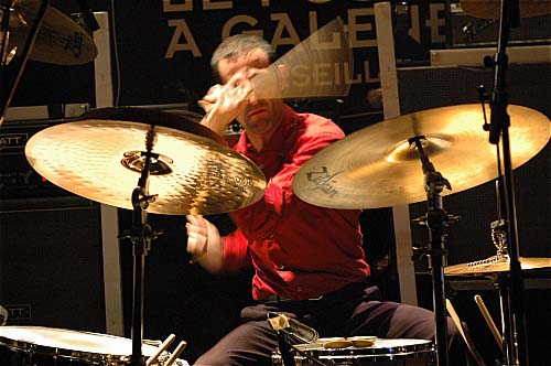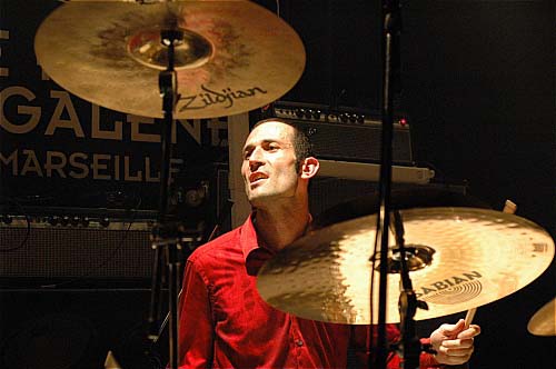 Et enfin, en maître d'orchestren, les très élégant Cyril, en costume KraftWerk époque Man/Maschine (chemise rouge sang/pantalon noir tiré à quatre épingles - ouf, je viens enfin de trouver à qui il me faisait penser) fracasse sa batterie ou, au contraire, titille délicatement de petites cymbales qu'il est le seul à entendre. Le trio formant une alchimie assez étonnante ou, encore une fois, jamais l'un ne prend longtemps le pas sur l'autre, alors que les trois jouent très souvent à fond les ballons.