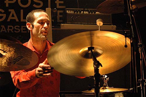 Le trio a eu l'excellente idée d'une configuration scénique idéale pour l'échange et la communion : tous trois en demi-cercle, le batteur Cyril Bilbeaud au centre (de la scène comme du projet semble-t-il), le guitariste "classique" (ici) Serge Teyssot-Gay à gauche, et le plus expérimental (ici) Marc Sens à droite. On comprend assez vite qu'on ne va pas trop rigoler : accrochez-vous, c'est du lourd. Aucun titre de chanson dans ma chronique (sauf à la fin) puisque je ne connaissais pas - sans filet donc. Même pas peur !