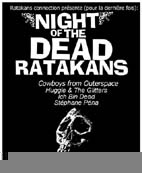 Soirée d'adieu de la Ratakans Connexion avec Ich Bin Dead (Ich Bin Dead : Garage rock, avec une voix féminine entre sensualité glamour, violence à fleur de peau et innocence perdue, soutenue par les riffs minimalistes et énervés des deux guitare sous tension permanente. Efficaces sur scène. Site : ichbindead.free.fr/ ), Huggie & The Glitters (Power Pop Glam Punk des plus dansant !), Cowboys From Outerspace (Rock garage. Un côté Elvis pas clean mâtiné de Cramps et de Blues Explosion. Efficaces sur scène comme sur disque. Leur site : www.chez.com/cowboysfromouterspace) et Péna (Chanson variable. Des mélodies simples et attachantes, des textes à fleur de peau ou à bout de nerfs, un!
